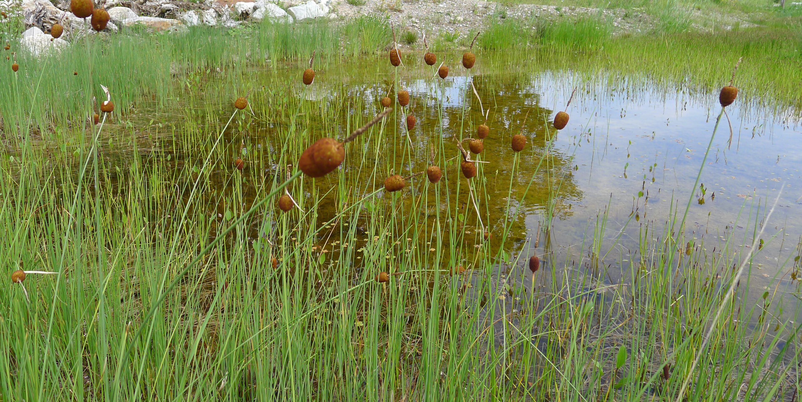 Der sehr seltene Zwerg-Rohrkolben ist eine Pionierart der Alpen- und Alpenvorlandflüsse mit natürlichem Geschiebetrieb. Er ist in Europa nur noch an ganz wenigen Orten zu finden (Durancetal, Hochsavoyen, Frankreich)